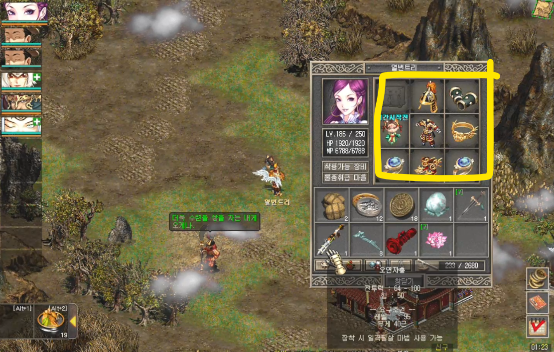 상위 사냥터로 진출하기 위해서 각성 뇌공, 250음양사, 물의 정령이 필요합니다.