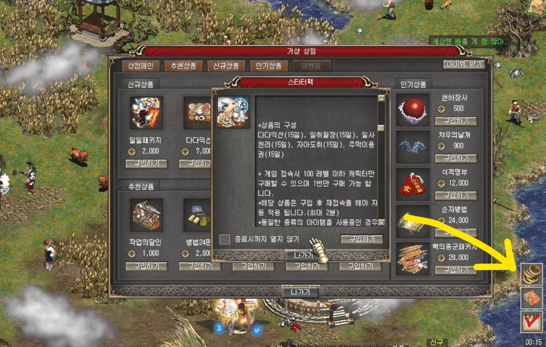 아까 홈페이지에서 받은 보상을 받으려면 우측 엽전 모양을 누르면 되는데 [스타터팩] 구매할거냐고 뜰겁니다.